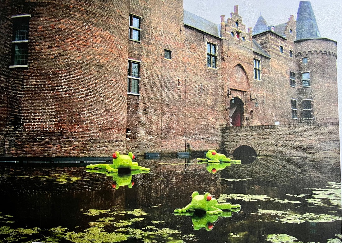 Een installatie van drijvende kikkers in de slot gracht van Gemeente Museum Helmond